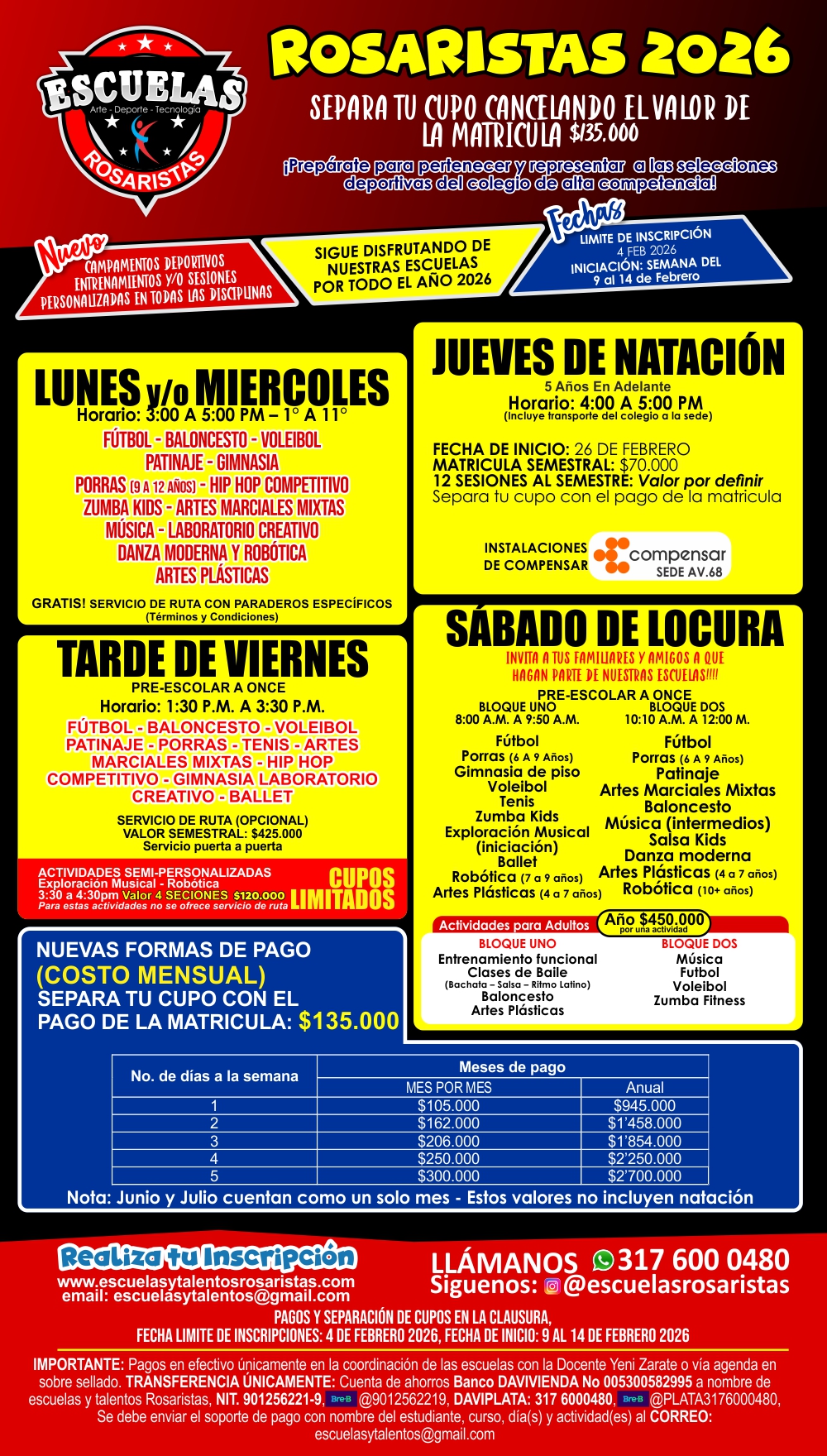 Échale un vistazo a todo lo que ocurre en Escuelas de Formación y Talentos Rosaristas. Podrás encontrar más información sobre nuestros eventos recientes y nuestras próximas actividades. También publicamos constantemente novedades e información sobre nuestros programas, incluyendo horarios de las actividades extracurriculares. Consulta los detalles en la siguiente sección y no te pierdas de nada.